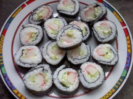 主要原料:蟹柳(2条), 青瓜(1条),沙拉酱(适量), 寿司饭 , 海苔(1片)
