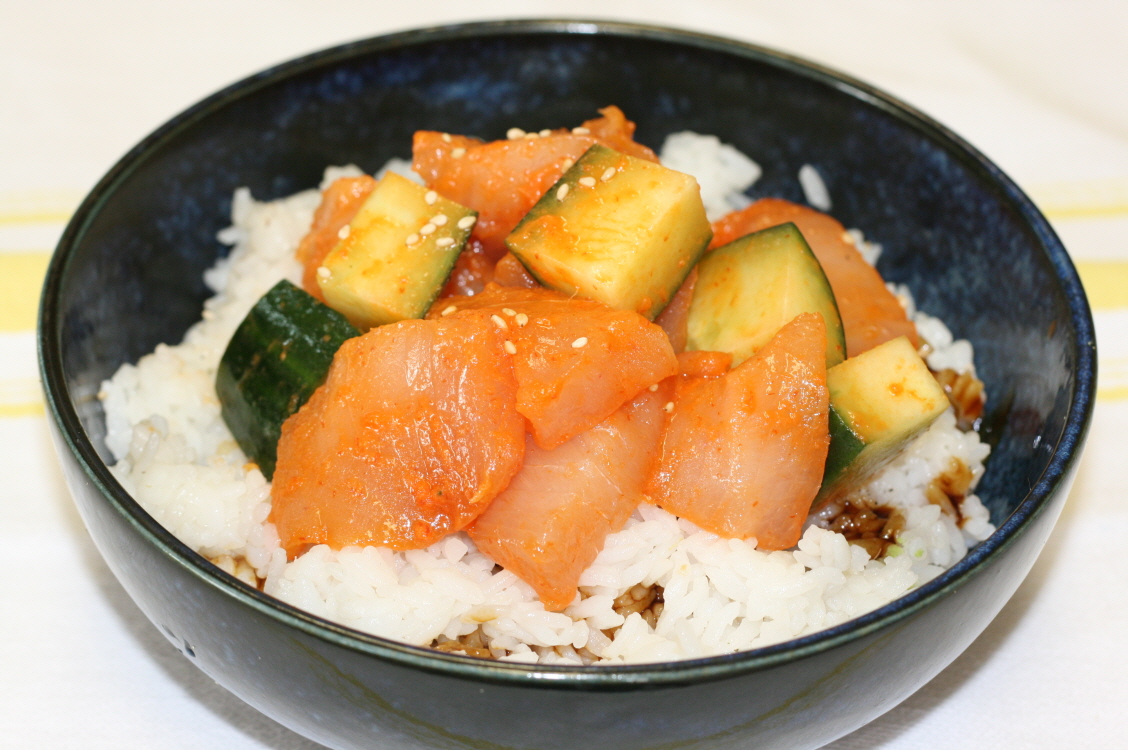 Spicy Tuna,Prawn Tempura with Salmon on top