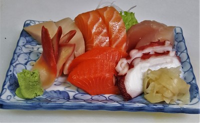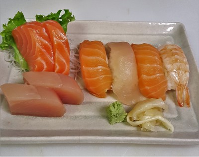 5 pcs Tuna-Salmon Sashimi,1 California Roll & 1 pc Tuna,Salmon & Ebi