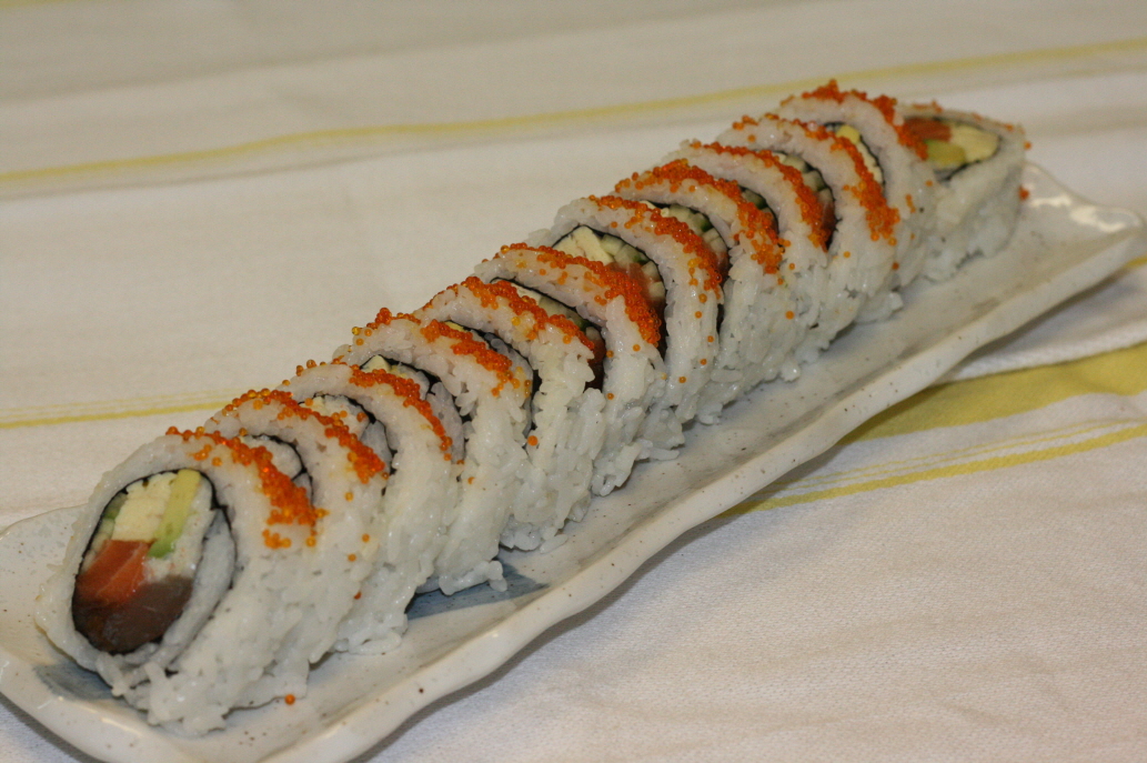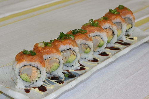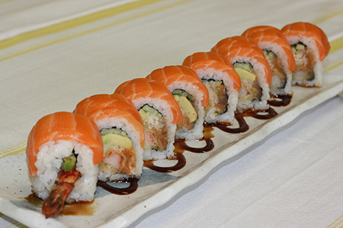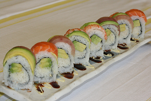 California Roll Wrapped with Tuna,Salmon,Ebi,Avocado on top