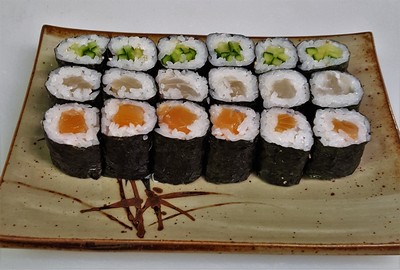 1 Salmon Roll,1 Kappa Roll,1 California Roll,1 Alaska Roll,3 pcs of Tuna,Salmon,Ebi,6 Pcs Pressed Sushi
